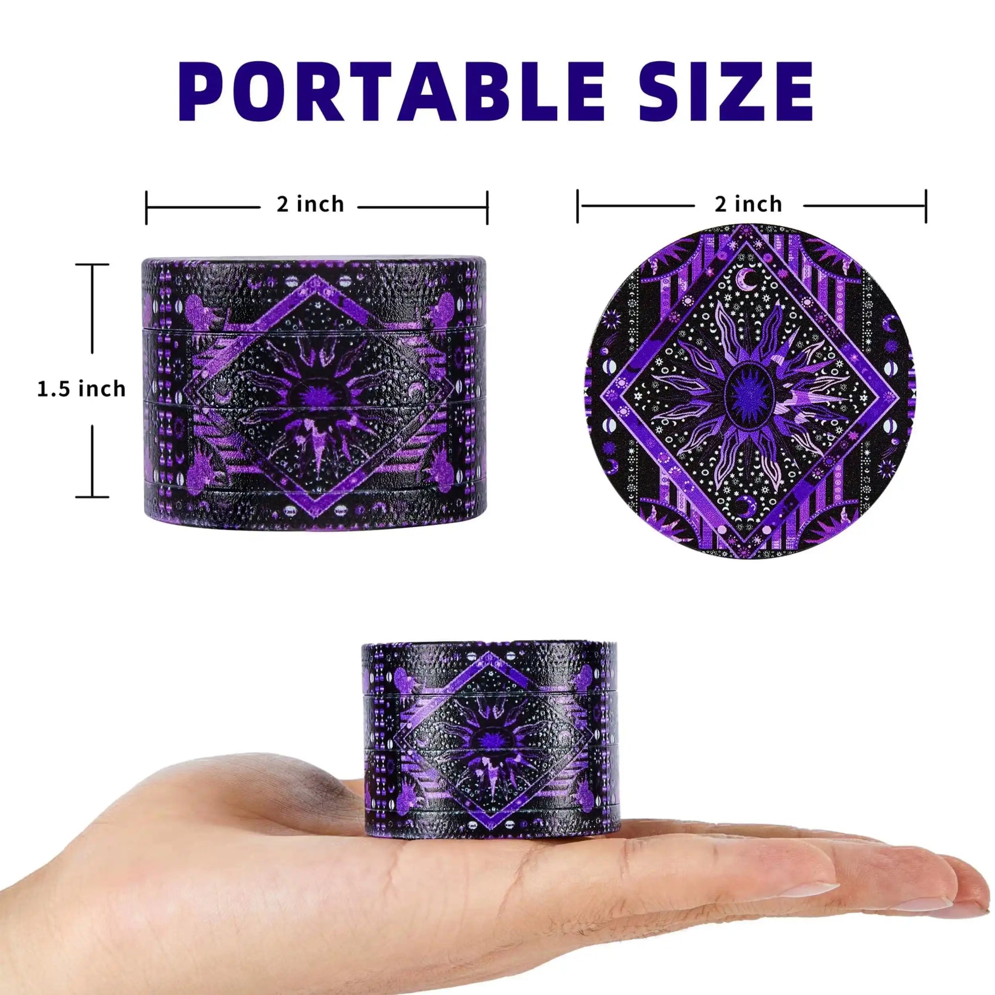 The grinder is 2" in size, featuring a 4-piece design with included pollen catcher to filter out fine particulates.